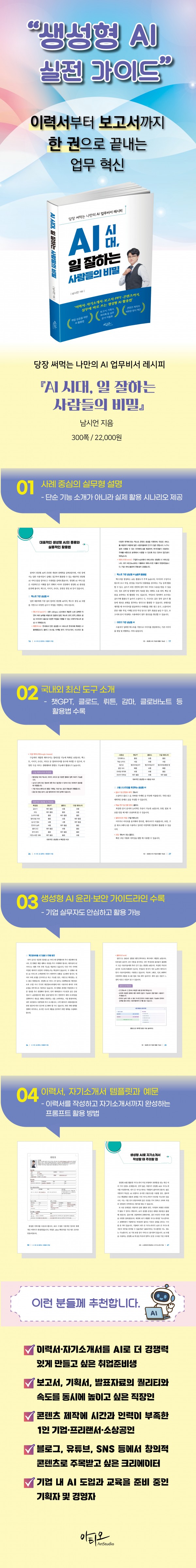 이 책은 텍스트, 이미지, 음성, 영상 등 다양한 생성형 AI를 실무에 적용하는 방법부터 이력서, 자기소개서, 발표 자료, 블로그 콘텐츠, 업무 문서 작성까지한 권에 담은 실전형 종합 가이드북입니다.